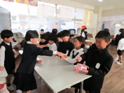 2年生がダンボールや紙コップ、割り箸などを使ってお店を作り、1年生を招待しました。2年生は、ルール説明や声掛けなどお兄さん、お姉さんらしく1年生を楽しませることができました。